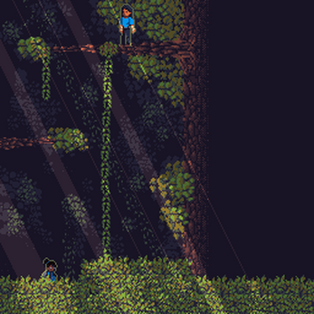 In attempting to develop a platformer level set in a tropical rainforest, I made these tiles and aseprite brush patterns and decided to mock up a scene from the game (the sunlight is added on with an overlay layer).